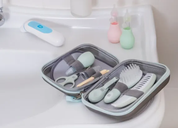 termometru digital, aspirator nazal, pieptene, perie de păr, masaj gingival pentru degete, unghieră, foarfece, pilă de unghii