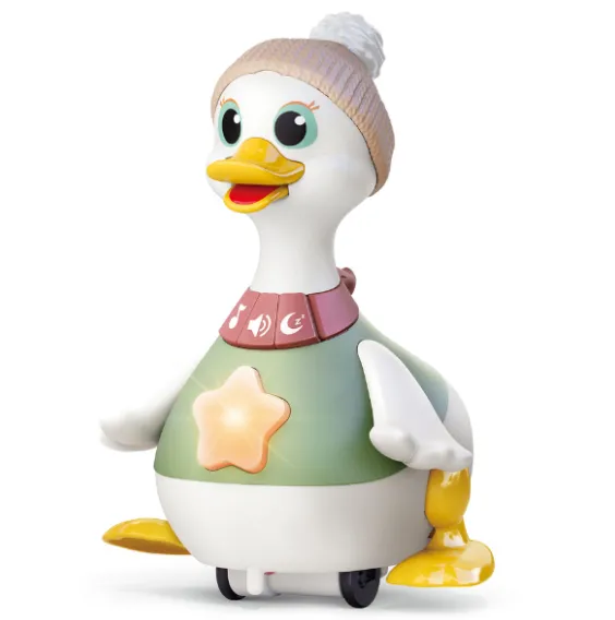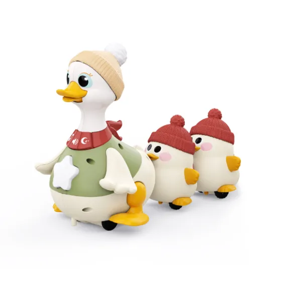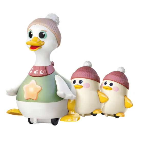 Setul include o rață mare și două rațuște mici. Mama rață mare poate merge alături de cele două rațuște mici, încurajând copilul să le urmeze și să interacționeze cu ele. La apăsarea butonului, jucăriile mici se pot roti, atrăgând atenția copilului și stimulând curiozitatea acestuia. Mama rață mare cântă 8 melodii vesele pentru copii, iar steaua de pe pieptul ei se aprinde, stimulând dezvoltarea vizuală (volumul poate fi reglat).