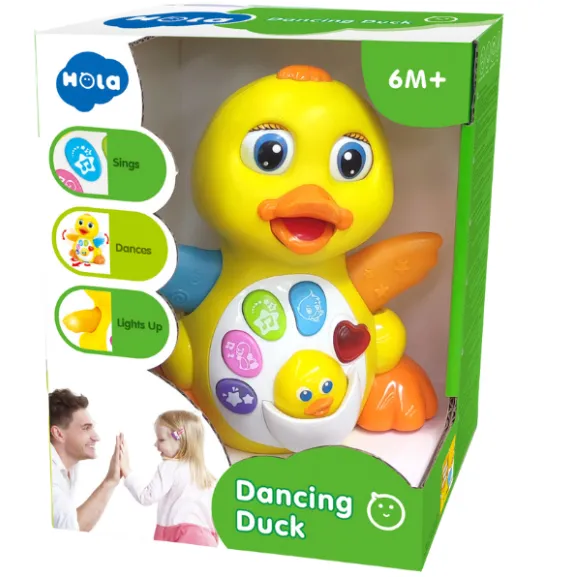 este o rățușcă care cântă, se mișcă, dansează și strălucește! Cu șase butoane diferite pe piept care redau melodii, voci și lumini intermitente, această rățușcă dansatoare muzicală îi va oferi micuțului multă distracție! De la ochi la aripi și corp, rața este luminoasă și stimulantă din punct de vedere vizual, arătându-i micuțului o mulțime de culori și lumini. În timp ce se mișcă, pasărea clipește din ochi, își deschide ciocul și își bate aripile strălucitoare. Bebelușului îi va plăcea să urmărească rățușca în timp ce aceasta se răsucește și își bate aripile.
