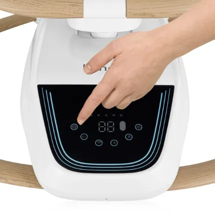 Balansoarul poate fi controlat de la distanță cu telecomanda inclusă sau direct prin panoul tactil încorporat.