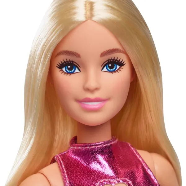 Ținută: Păpușa poartă o rochie mini strălucitoare de culoare roz metalizat, subliniindu-i aspectul la modă.