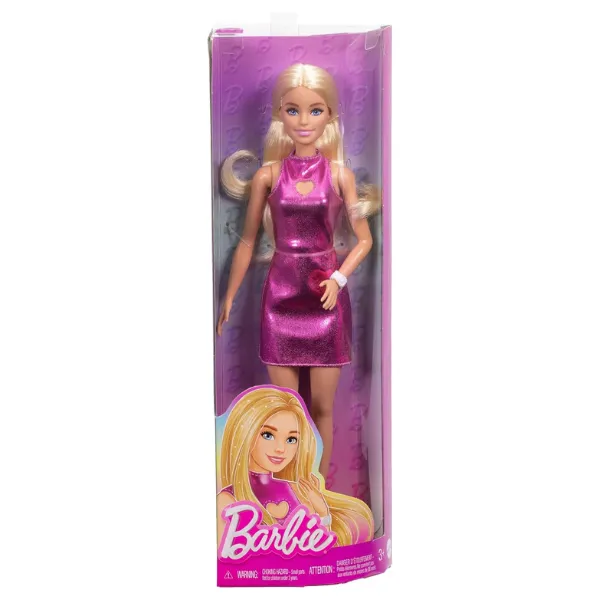 Vă prezentăm păpușa Barbie Fashionistas în rochie mini roz metalic (HYT88), care întruchipează stilul modern și diversitatea.