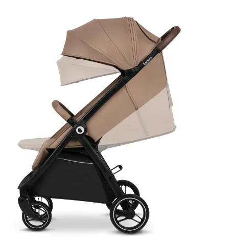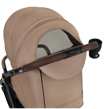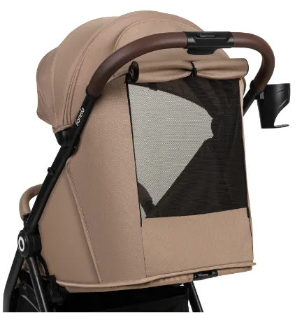 Copertina spațioasă oferă confort și protecție chiar și pentru copiii mai mari. Este impermeabilă și are cel mai mare factor de protecție solară (UPF 50+). Căruciorul este echipat cu o protecție solară care oferă adăpost de soare și un panou detașabil ce permite extinderea suplimentară a copertinei. Setul include un plasă pentru țânțari și un suport pentru băuturi.