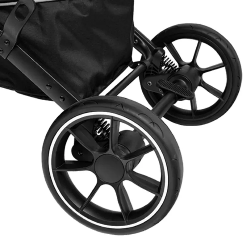 Amortizare independentă Caruciorul are suspensie atât pe roțile din față, cât și pe cele din spate. Toate sunt realizate din spumă UP rezistentă la perforare. Roțile din față au si o funcție de blocare pentru a conduce drept înainte, iar roțile din spate au o frână convenabilă.