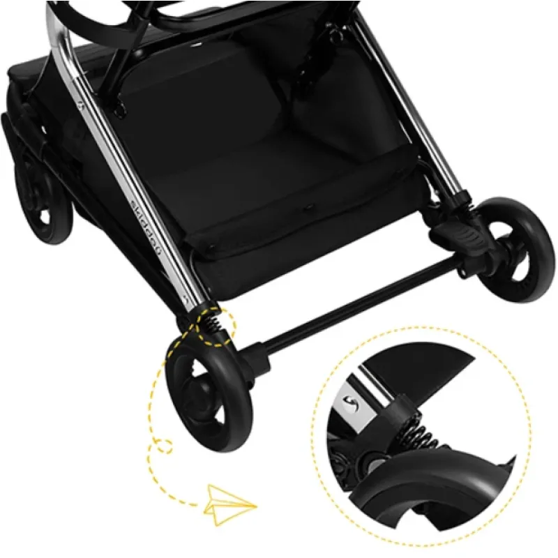АмортизацияНаша коляска Mikkeli — это легкая коляска с хорошей амортизацией, которая обеспечивает комфорт при вождении. Отличается тем, что амортизация есть как на передних, так и на задних колесах.