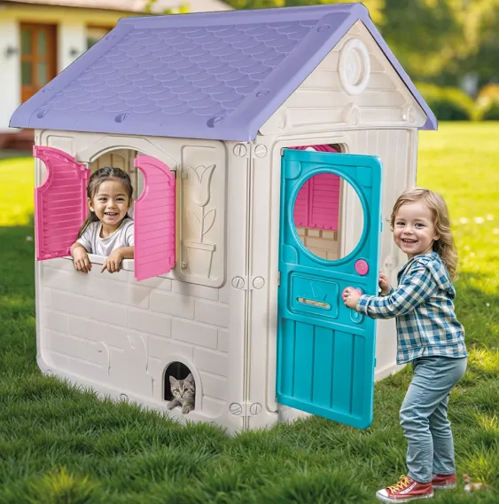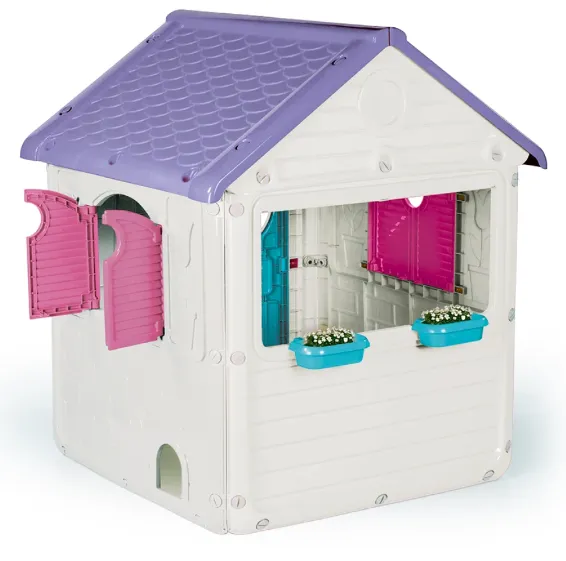 Modelul este prevăzut cu ușă funcțională, ferestre cu obloane, sonerie electronică și cutie poștală, detalii care fac jocul de rol mai realist și mai distractiv. În plus, căsuța include ușiță pentru animale și suporturi pentru ghivece, pentru un aspect mai jucăuș și mai interactiv.