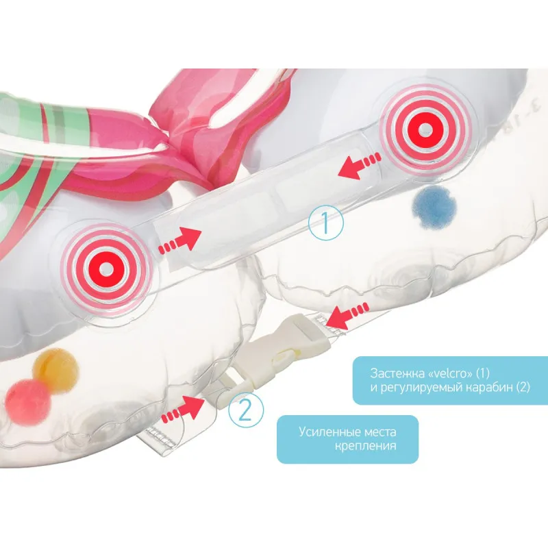 Accesoriul gonflabil pentru gatul bebelusului este realizat din polimer modern sigur si are, de asemenea, doua camere de aer, in interiorul carora se afla mingi de zornaie pentru o experienta de baie mai incitanta pentru bebelus.