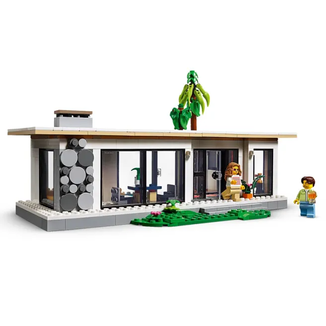 Băieții și fetele cu vârste de până la 9 ani pot descoperi 3 case LEGO diferite cu acest set distractiv Modern House. Casa luxoasă cu 2 etaje de pe plajă este umbrită de 2 palmieri și are o bucătărie, un living, o cameră de lectură, un dormitor, o cabină de duș, un balcon și mobilier modern, inclusiv un fotoliu și un candelabru. Există, de asemenea, o piscină pentru povești distractive. Acest set de construcție LEGO oferă o lume plină de posibilități, cu 3 case diferite de construit cu același set de cărămizi. Copiii pot construi o casă modernă, apoi o pot transforma într-o clădire de oraș elegantă cu 3 etaje, cu o cadă cu hidromasaj și o terasă pe acoperiș sau o pot transforma într-o cabană în pădure.