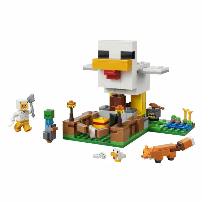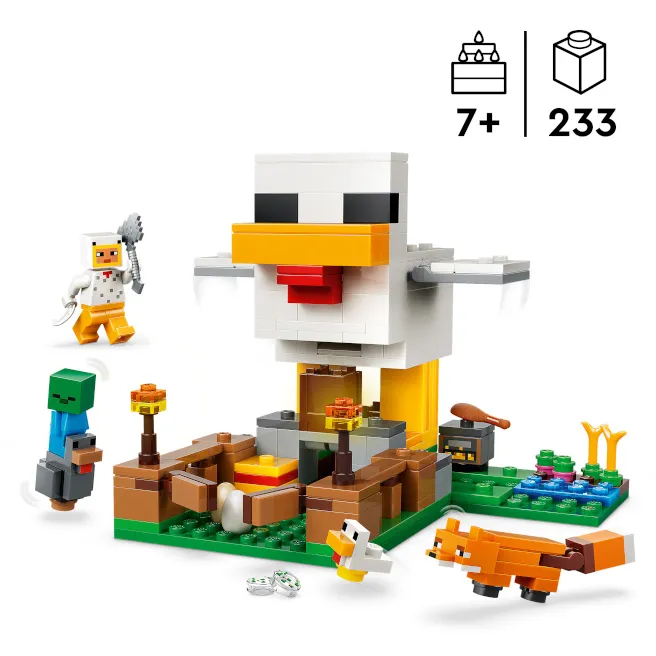 Îngrijește găinile și cultivă recolta cu jucăria LEGO® Minecraft® „Ferma de găini” (21585) pentru fete și băieți de la 7 ani. Acest set de jocuri pentru copii oferă jucătorilor posibilitatea de a avea grijă de o găină și un pui cu minifigurina Chicken Fan, precum și de a se descurca cu o vulpe (care adoră să mănânce găini) și un mic zombie (care adoră să se dea cu găinile).