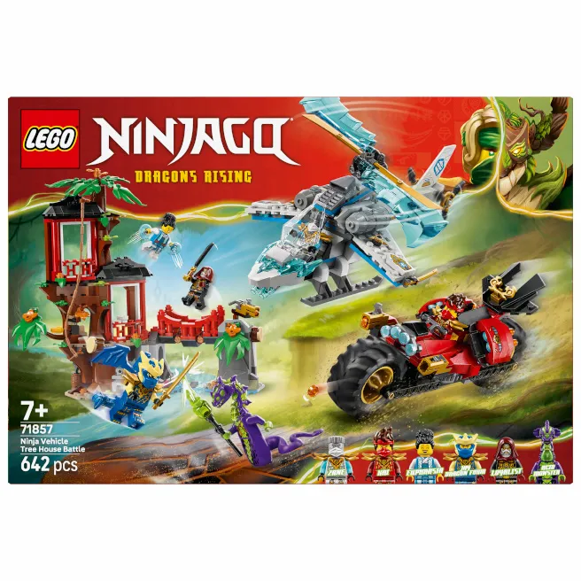 Băieții și fetele cu vârsta de peste 7 ani vor avea tot ce le trebuie pentru a pune în scenă acțiuni de luptă cu acest set de asamblat „Casă în copac și vehicule ninja” (71857), bazat pe sezonul 4 al serialului TV „NINJAGO®: Răscoala dragonilor”. Acest set de jocuri include o căsuță în copac cu 3 etaje, un elicopter de jucărie, o mașină de curse ninja de jucărie și 6 minifigurine.