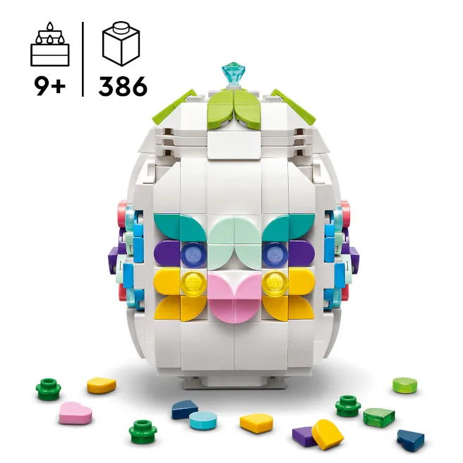 Cu ajutorul acestui set de asamblare, puteți crea propriul ou de Paște și îl puteți decora cu elemente LEGO colorate, inclusiv o inimă aurie și o mică piatră prețioasă. Oul de jucărie are o bază plată pentru a fi expus cu ușurință și o parte superioară care se deschide și poate fi îndepărtată pentru a depozita în interior elemente suplimentare.