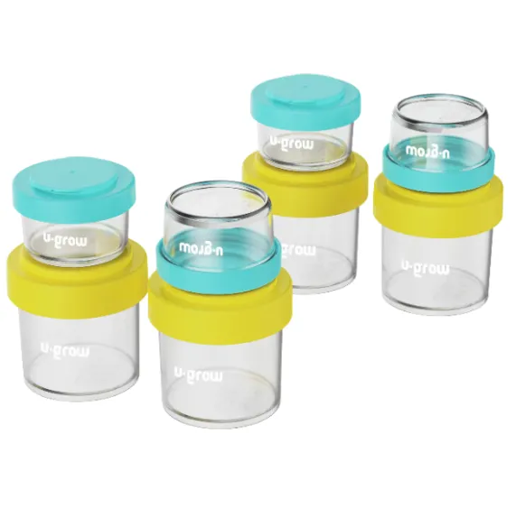 Recipientele pentru stocarea alimentelor U-Grow sunt versatile, ușor de utilizat și concepute să crească odată cu bebelușul tău. Acestea sunt ideale pentru păstrarea alimentelor atât acasă, cât și în deplasare. Setul este compus din 4 recipiente de 80 ml și 4 recipiente de 220 ml. Capacul se fixează perfect și este etanș, asigurând că nu se vor scurge dacă sunt corect închise.