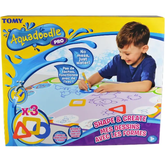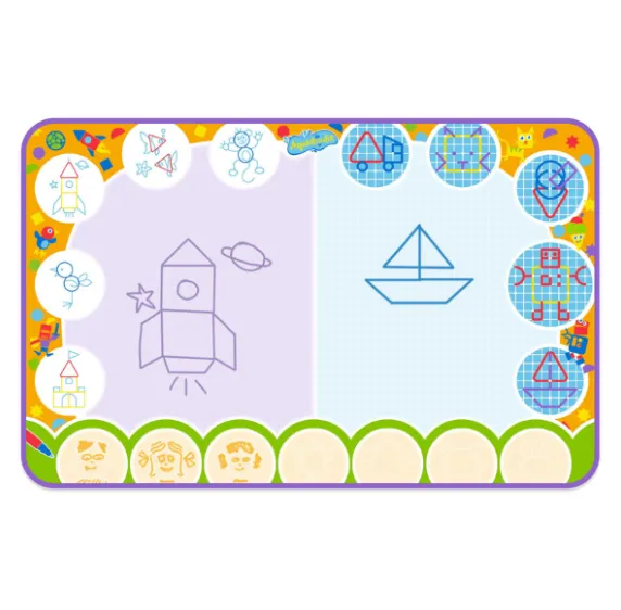 Conținutul pachetului: Setul include un covor, un marker Aquadoodle și trei șabloane cu forme geometrice.