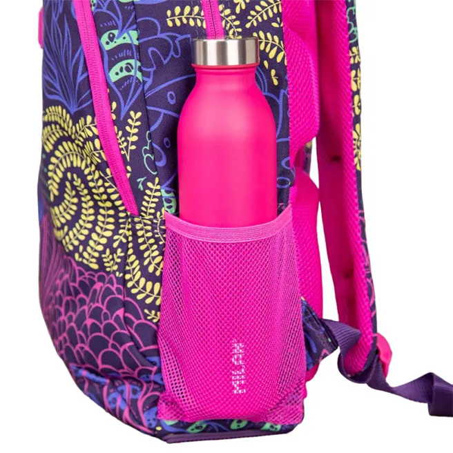 Ghiozdan școlar cu 2 fermoare. Serie specială Fireflies, un imprimeu creat prin diferite forme de vegetație și frunze, reprezentând mediul în care trăiesc licuricii. Culorile sunt la fel de strălucitoare ca lumina licuricilor: lila, fucsia, galben și verde, care ies în evidență pe o bază lila închis. Fermoare și detalii fucsia. Un buzunar principal cu compartiment interior protector pentru laptop și un buzunar frontal. Două buzunare laterale din plasă pentru acces ușor. Mânere reglabile, spate căptușit și respirabil, bază întărită. Permite adăugarea unui troler pentru rucsac. Compoziție din material: căptușeală exterioară și interioară din poliester. Dimensiuni: 45 x 30 x 12 cm. Capacitate: 21 de litri.