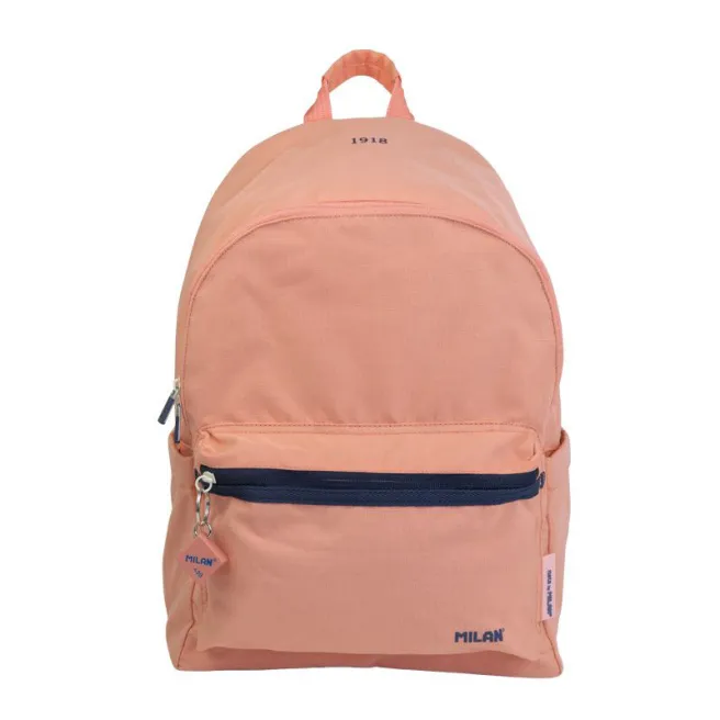Rucsac urban clasic cu 2 fermoare. Seria 1918, culoare roz cu detalii bleumarin. Inspirat de culorile și designul originale ale radierelor MILAN, fabricate în Spania din 1918. Compartiment principal cu husă de protecție pentru laptop. Buzunar frontal și două buzunare laterale cu velcro cu acces rapid. Bretele reglabile, spate căptușit și respirabil. Buzunarul frontal include un inel de chei cu gumă de șters 430 pe mânerul cu fermoar. Captuseala interioara bleumarin imprimata cu o grila care evoca forma radierelor MILAN. Țesătură exterioară „Ripstop”: ușoară și rezistentă la coacere și rupere. Utilizează o tehnică specială care țese fire groase de armare la intervale regulate, creând un model încrucișat. Compoziția țesăturii: țesătură exterioară din poliester și căptușeală interioară. Dimensiune: 41 x 30 x 18 cm. Capacitate: 22 litri.