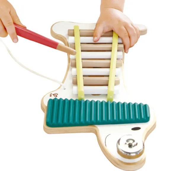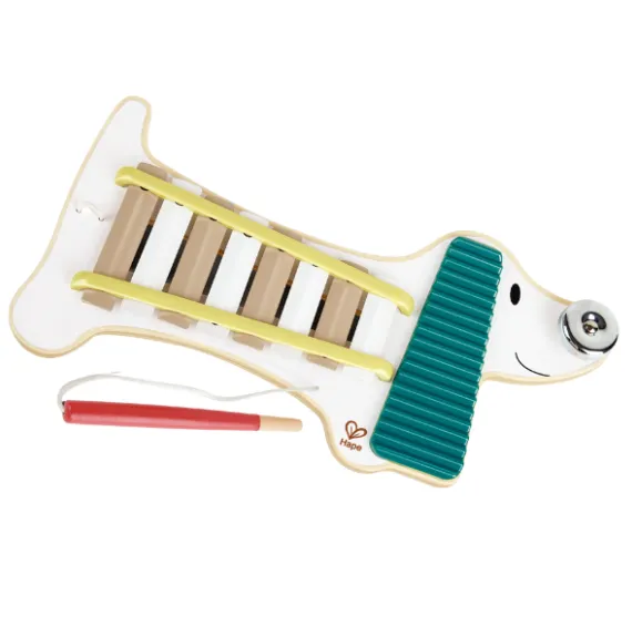 Adorabila cățelușă Xenia de la Hape nu este doar o jucărie, ci o prietenă muzicală specială pentru cei mici. Ea combină trei instrumente într-unul singur: xilofon, zornăitoare și un clopoțel pe năsuc. Copiii pot cânta la plăcile xilofonului cu bagheta, pot zgudui zornăitoarea sau pot face clopoțelul să sune, compunând primele lor melodii.