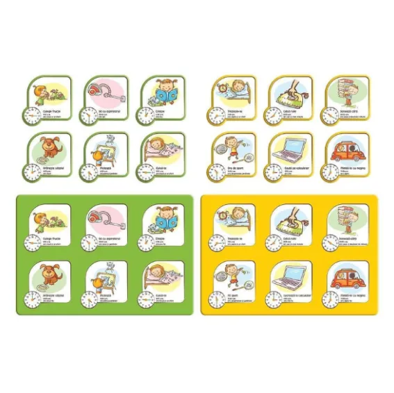 Alege o planșă și completează casetele ilustrate cu cartonasele corespunzătoare, pe care sunt reprezentate aceleași ore și activități. Fiecare jucător trebuie să găsească cartonasele corecte și să le așeze în dreptul orei și activității potrivite. Primul jucător care își completează planșa câștigă!