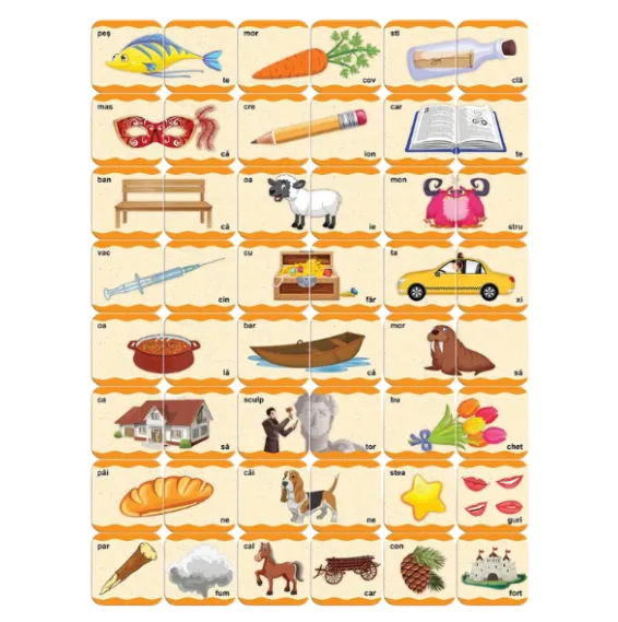 Setul conține 48 de cartonașe cu silabe și ilustrații. Acestea formează perechi de câte două silabe, care compun un cuvânt atunci când sunt potrivite corect. Reguli de joc: amestecă toate cartonașele și așază-le pe masă cu fața în jos. Cel mai tânăr jucător începe jocul, trăgând un cartonaș și punându-l cu fața în sus în dreptul său. Următorul jucător procedează la fel.