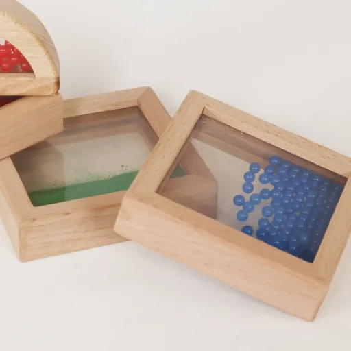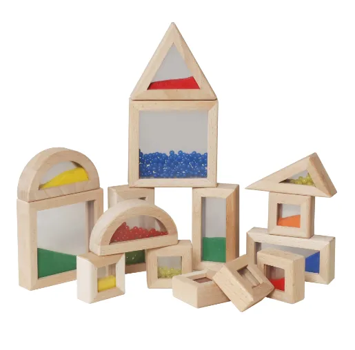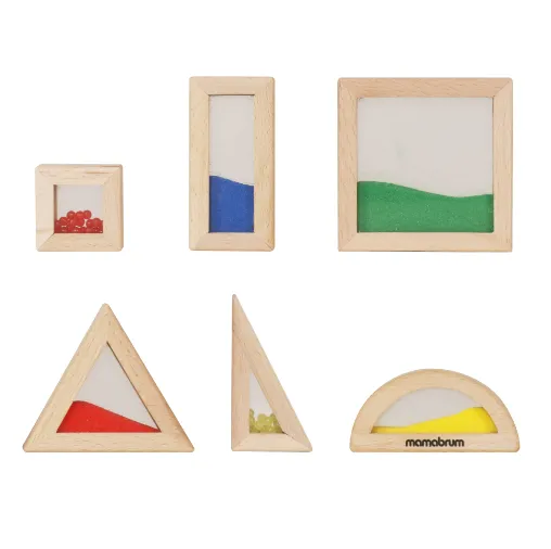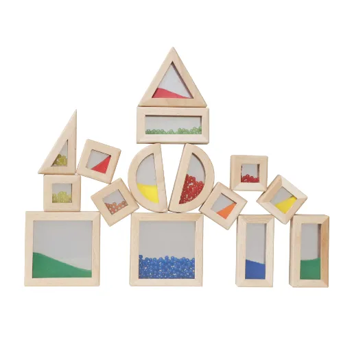 6 blocuri mari din lemn, umplute cu mărgele, acril transparent, nisip colorat și apă / sclipici, în 4 forme diferite (pătrat, dreptunghi, triunghi și semicerc).