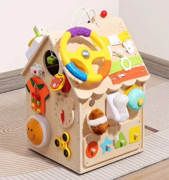 Jucându-se, copilașul tău apucă, deschide/ închide ușile și încuietoarele, rotește fidget-ul, aprinde luminițele, scoate sunete la claxon și la xilofon, desprinde magneții de la formele geometrice , desface fermoare/ scai/ triden, se privește în oglindă, simte diferite texturi, urmărește cifre, numără mărgeluțe, înoadă fundițe etc.