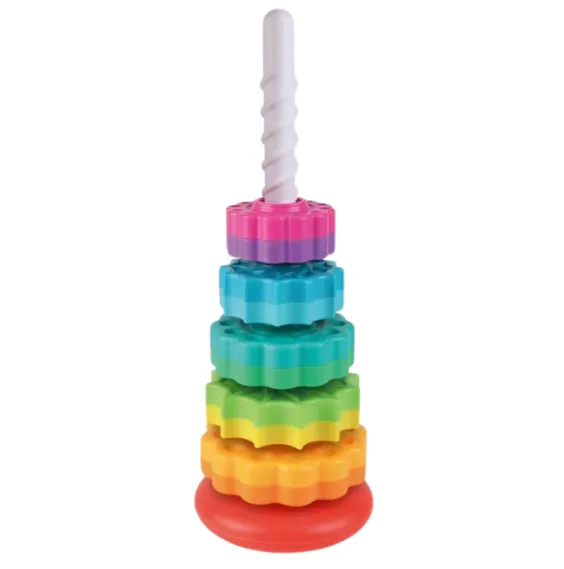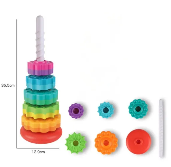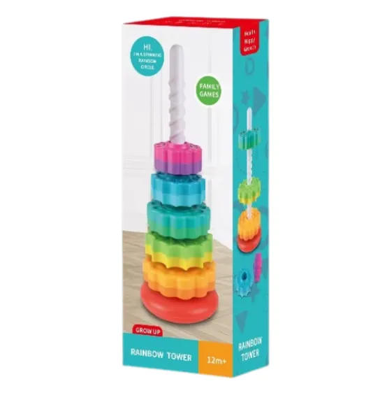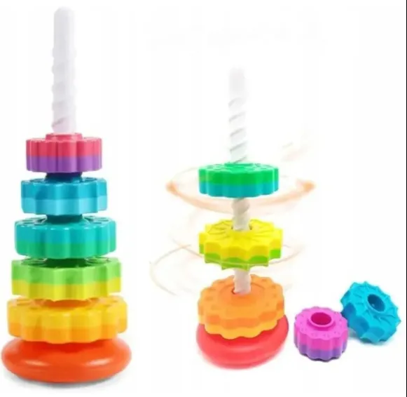 Piramida „Curcubeu” este o jucărie educativă captivantă pentru copiii de la 1 an. Formată din 5 inele colorate, care se așază pe suport, ajută la dezvoltarea coordonării mână-ochi, a motricității fine și a înțelegerii dimensiunilor. Turnul se rotește ușor, adăugând un plus de distracție și stimulând percepția vizuală.