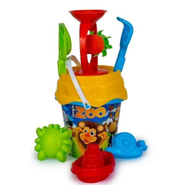 Setul include: găleată, capac – sită, lopată, greblă, o moară pentru nisip și apă, corabie și forme pentru nisip