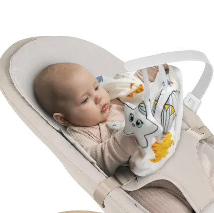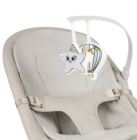 Bară de jucării detașabilă. Două jucării captează atenția bebelușului, încurajându-l să le atingă și să-și exerseze mâinile. Bara de jucării este detașabilă pentru confort.
