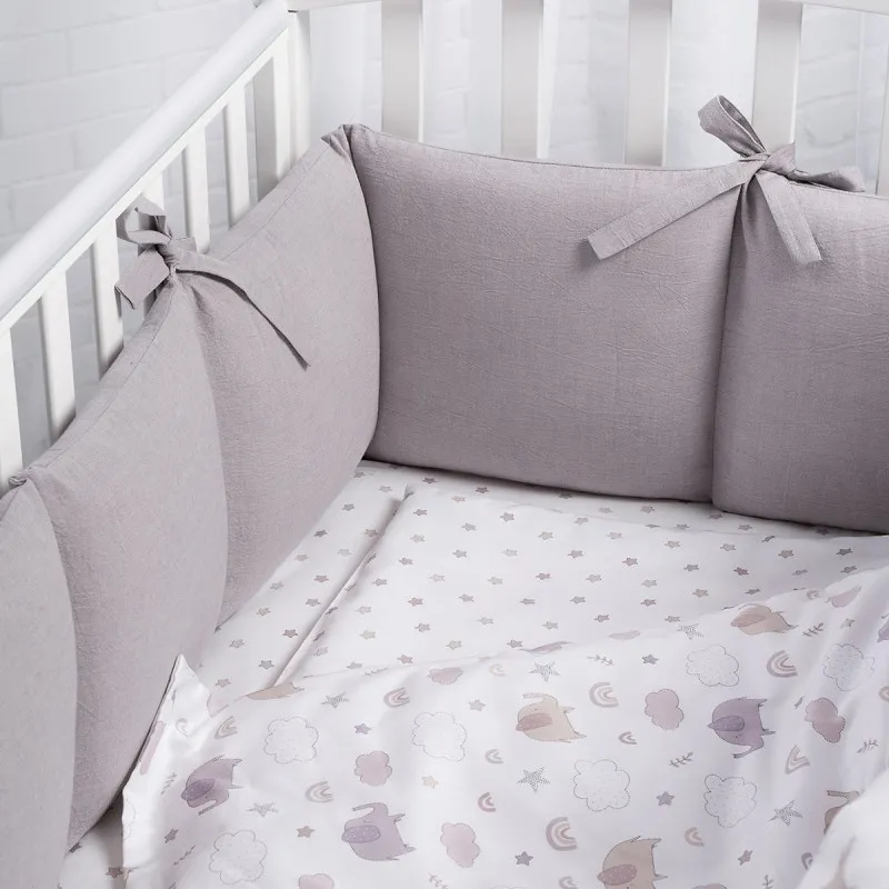 Seturile sunt asortate ideal cu barele de protecție pentru pătuț din bumbac moale, de culoare gri.