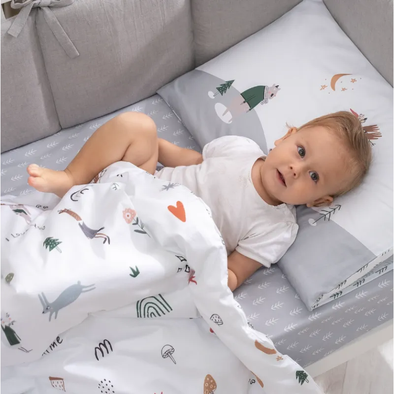 Lenjeria de pat Forest Baby este potrivită pentru un pătuț de nou-născut cu o zonă de dormit de 120×60 cm. Husa de pilota cu două fețe se combină favorabil atât cu o față de pernă, cât și cu un cearșaf.