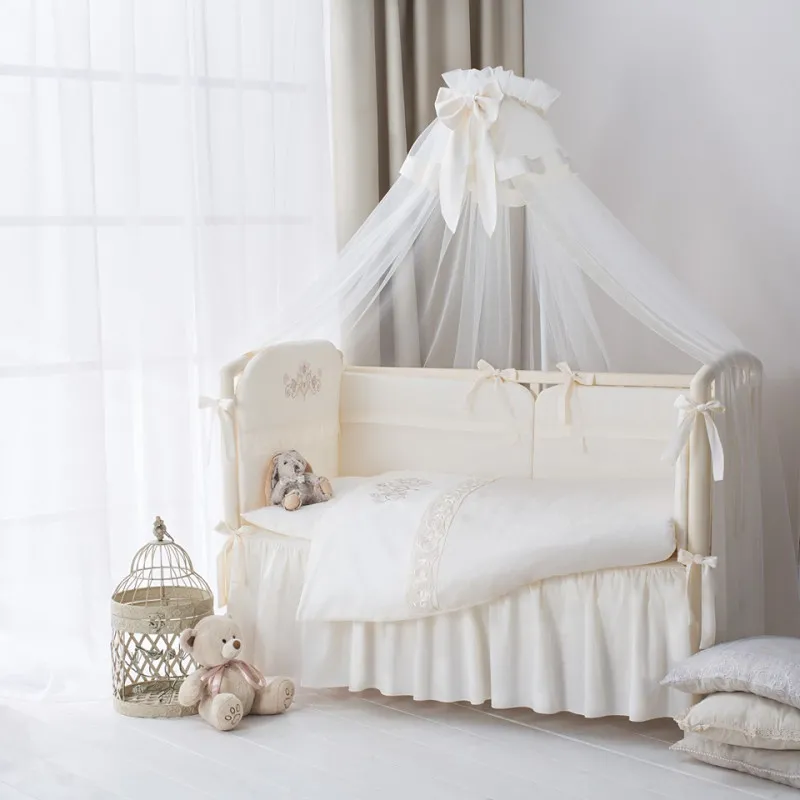 Setul de lenjerie de pat ''Versailles'' este creat pentru prinți și prințese nou-născute. Lux francez- satin sofisticat, o țesătură incredibil de moale, un model din bumbac și fibre de bambus de înaltă calitate combinate cu dantelă sofisticată. Broderiile grațioase în culoarea șampaniei vor deveni o decorare autentică pentru camera copilului și vor crea un comfort deosebit pentru el.