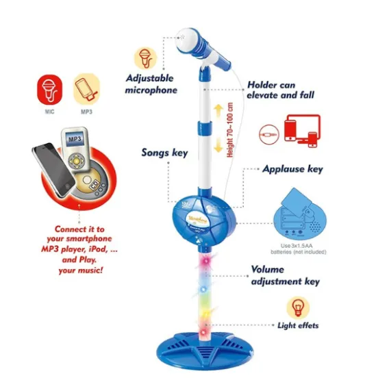 Microfonul are reglaj al volumului, 10 melodii încorporate și se oprește automat după 20 de minute de inactivitate pentru a economisi energia.