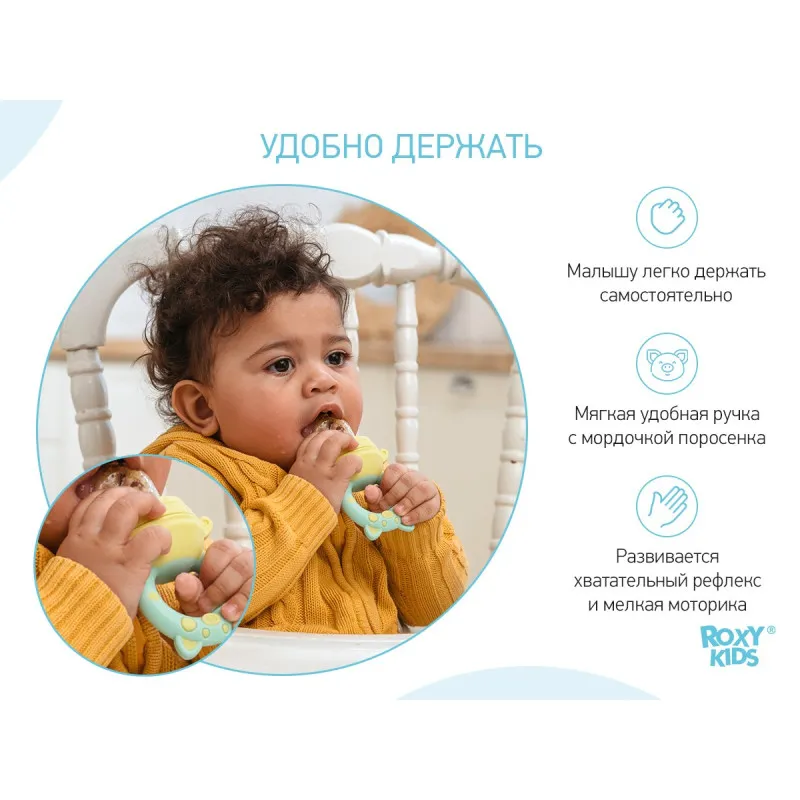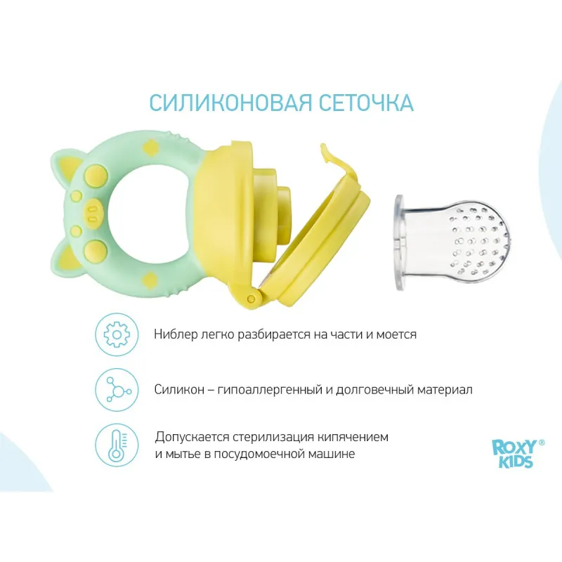 Niblerul pentru bebeluși de la ROXY-KIDS vă va ajuta să introduceți ușor și convenabil fructele, legumele și prăjiturile în dieta bebelușului dumneavoastră.