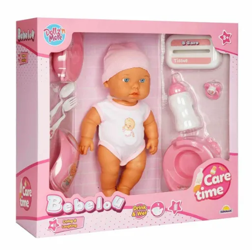 Ai burtica plină, dar ți-e sete? Îți aduc un biberon. Gata! Te simți mai bine acum, nu? Atunci hai să atașăm suzeta și e timpul să ne jucăm. Ai udat patul pentru că ai băut prea mult? Nicio problemă, olita este chiar aici, împreună cu setul de joacă Bebelou Sound Care Time Baby. Voi apăsa butonul de pe burtica ta care scoate sunete de râs și plâns ca să te facă să râzi și să te înveselești. Nu-ți face griji, eu voi avea grijă de tine!