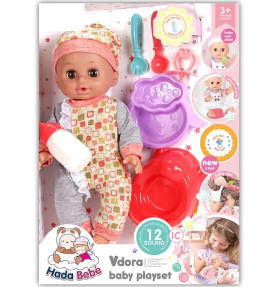 Micuța drăguță, îmbrăcată într-un costum moale și cu o bentiță pe cap, arată ca un adevărat bebeluș. Setul include tot ce este necesar pentru îngrijire — biberon, bol, lingurițe și alte accesorii.
