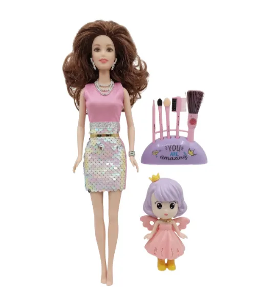 Acest set de joacă va fi un cadou minunat pentru o mică fashionistă, oferind spațiu pentru povești creative și jocuri vesele. În centrul atenției se află o păpușă elegantă, înaltă de 28 cm, cu păr castaniu luxuriant, îmbrăcată într-o rochie spectaculoasă, decorată cu paiete strălucitoare. Ea este însoțită de o păpușă mini fermecătoare, îmbrăcată într-o rochie roz delicată, cu aripi și o coroană aurie, care amintește de o zână din basme.