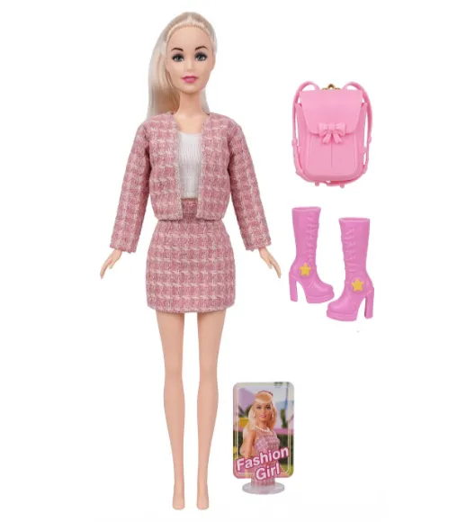 Blonda fermecătoare, înaltă de 29 cm (11,5 inci), este îmbrăcată într-un costum elegant roz din țesătură texturată cu imitație de tweed, format dintr-o jachetă scurtă și o fustă mini. Ținuta este completată de cizme elegante, înalte, de culoare roz, cu toc.