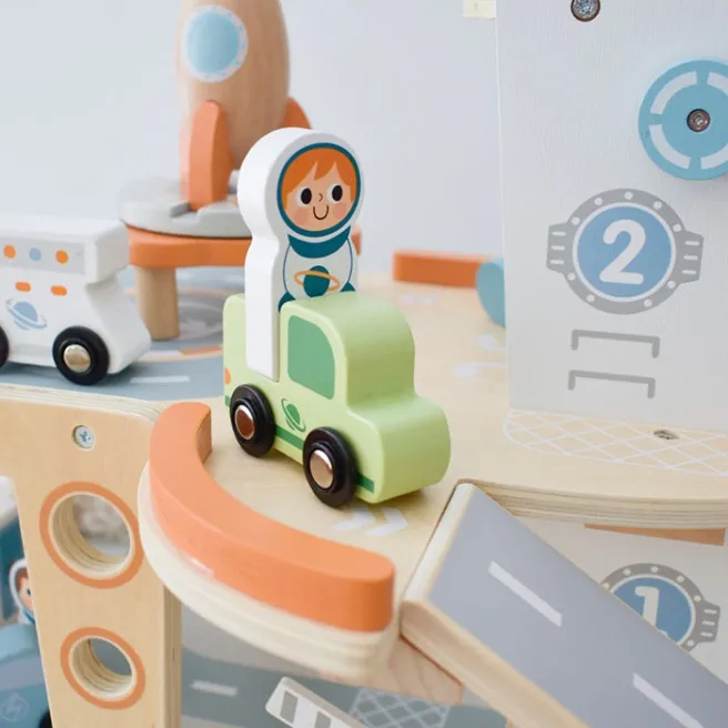 Lansează-ți imaginația cu setul de joacă Space Station de la Tooky Toy. Acest set din lemn cu mai multe niveluri combină aventura spațială și distracția cu vehicule: rampe, rampă de lansare a rachetelor și rampă de aterizare pentru OZN-uri. Cele 14 piese - roboți, astronauți, extratereștri, vehicule și accesorii - le vor permite copiilor să își creeze propriile povești spațiale din nou și din nou.