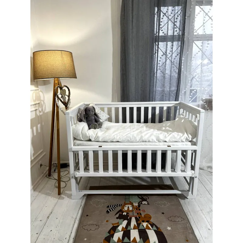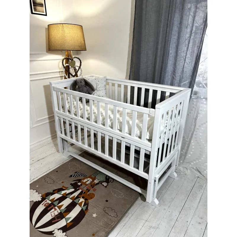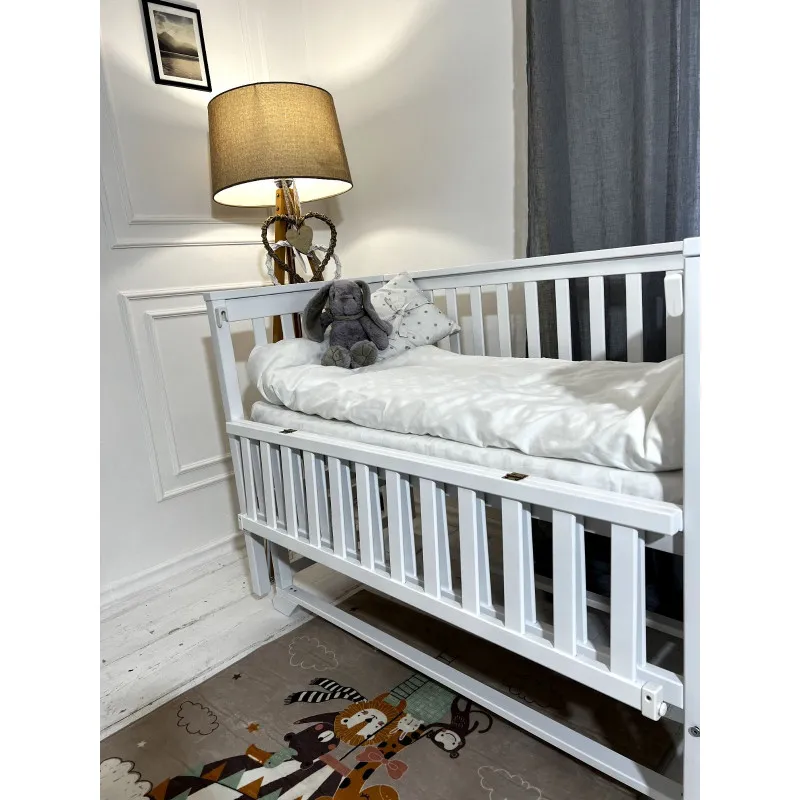 Patul are un perete lateral rabatabil, un mecanism de legănare (pendul longitudinal) silențios pe rulmenți;