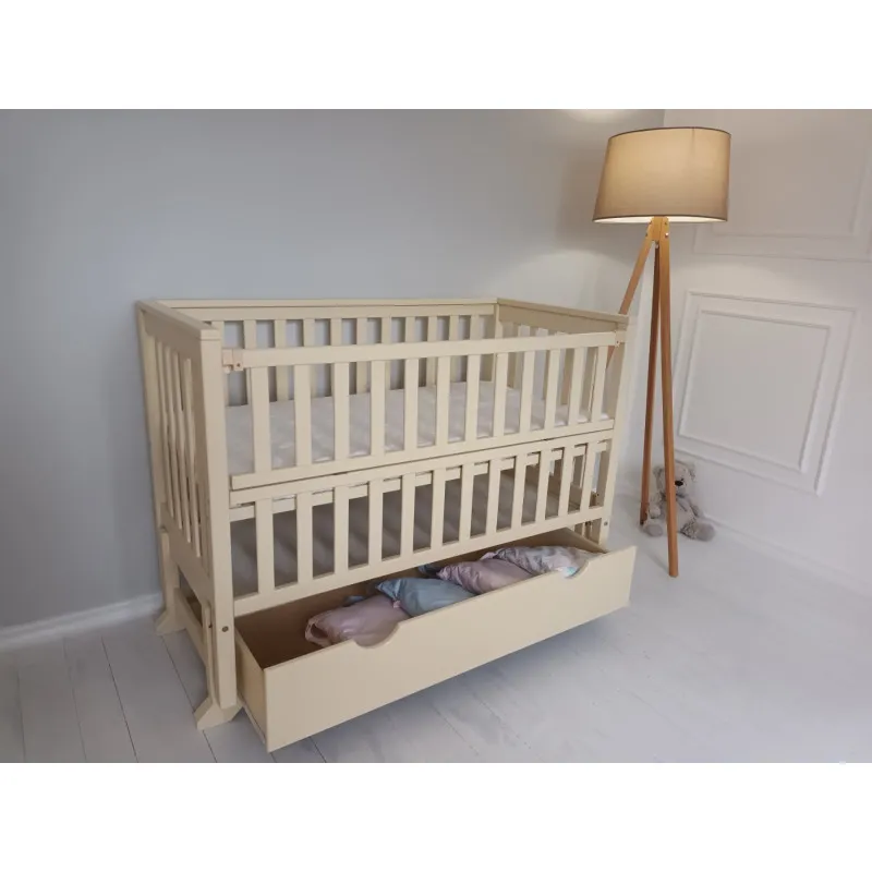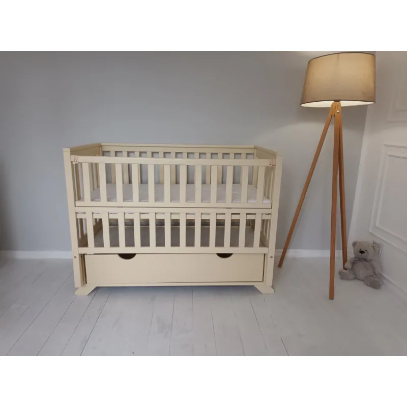 • Patul are un perete lateral rabatabil, un mecanism de legănare (pendul longitudinal) silențios pe rulmenți;