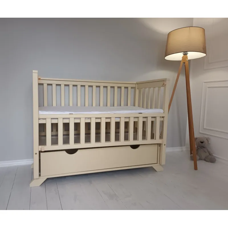 Pătuțul este prevăzut cu o bară laterală detașabilă, care servește drept barieră de protecție pentru bebeluș și în același timp îți ușurează accesul la bebeluș. Peretele lateral este fixat cu cleme de plastic.