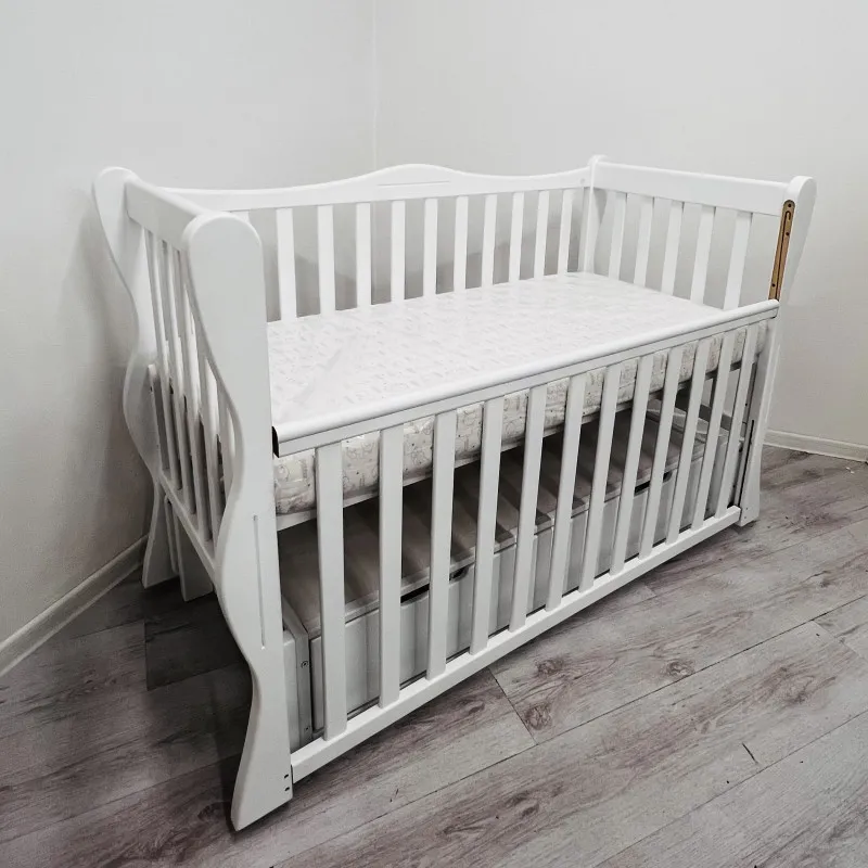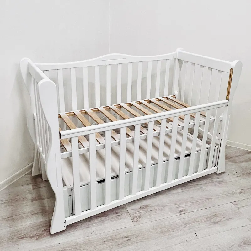 Patul are un perete lateral rabatabil, un mecanism de legănare transversal silențios pe rulmenți;