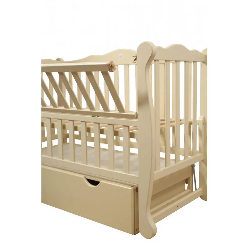 Patul are un perete lateral rabatabil, un mecanism de pendul silențios pe rulmenți;