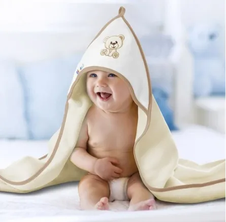 Realizat din bumbac 100% de înaltă calitate, prosopul absoarbe perfect apa și protejează capul umed al bebelușului împotriva frigului. Croiala lejeră nu restricționează mișcările copilului după baie.