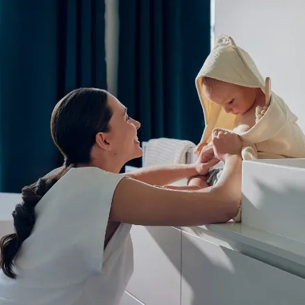 Pe lângă faptul că menține capul copilului cald după baie, gluga contribuie la formarea unor asociații pozitive cu timpul de baie.