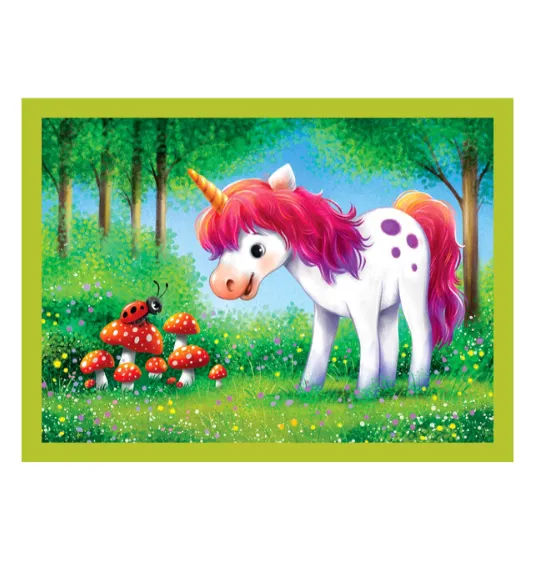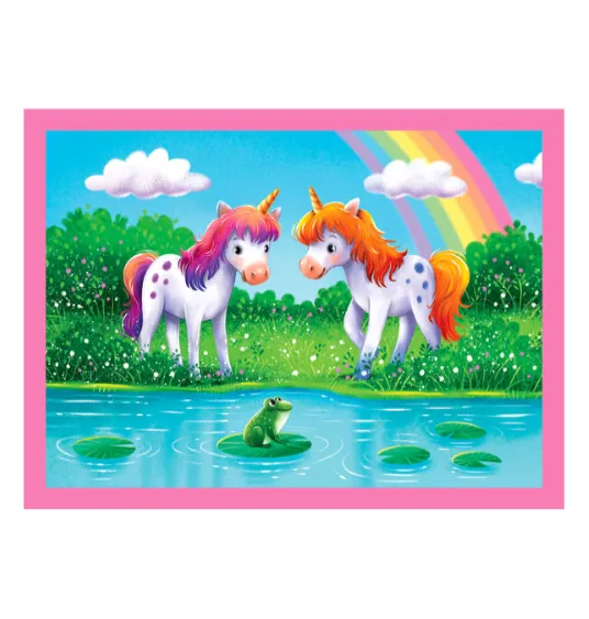 Puzzle Clementoni "4 în 1 „O zi cu unicorni” este un set colorat de puzzle-uri pentru copii, cu ilustrații magice ale unicornilor, care îl ajută pe copil să petreacă timpul într-un mod plăcut și util. Imaginile viu colorate atrag atenția, iar piesele sunt potrivite pentru primele activități de asamblare.