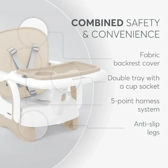 Proiectat cu siguranța în prim-plan, scaunul de înălțare include un sistem de centuri în 5 puncte, care menține copilul în siguranță în timpul mesei, oferind liniște pentru părinți și confort pentru cei mici.