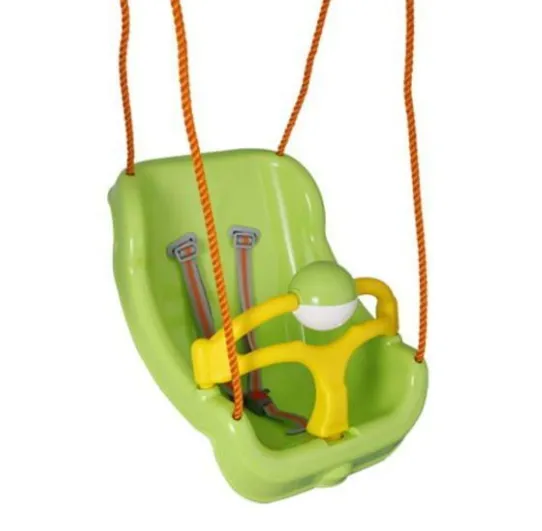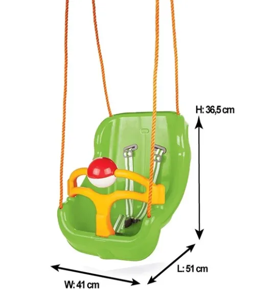 Șezutul leagănului se potrivește pentru copiii de la varsta de 1 an și dispune de suport pentru spate, dotat cu centuri de siguranță, iar in față o bară de protecție detașabilă în formă de T (cu zornăitoare). De asemenea, în set cu leagănul sunt incluse frânghii sintetice flexibile cu carabine.