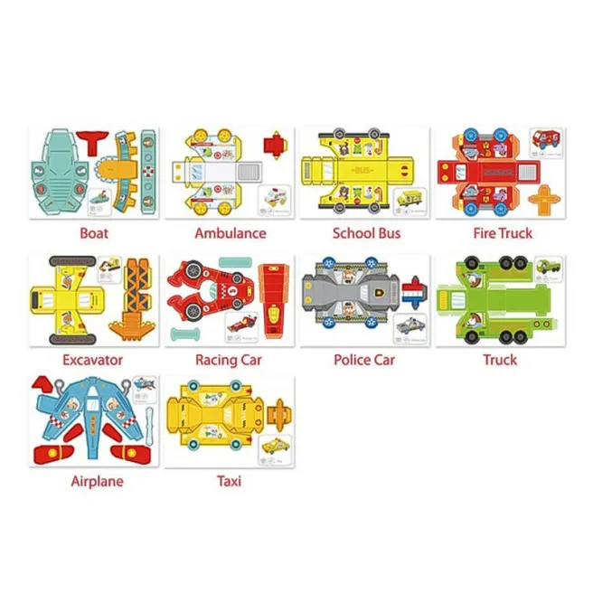 Setul include 10 foi de hârtie colorată cu șabloane pentru 10 vehicule diferite.