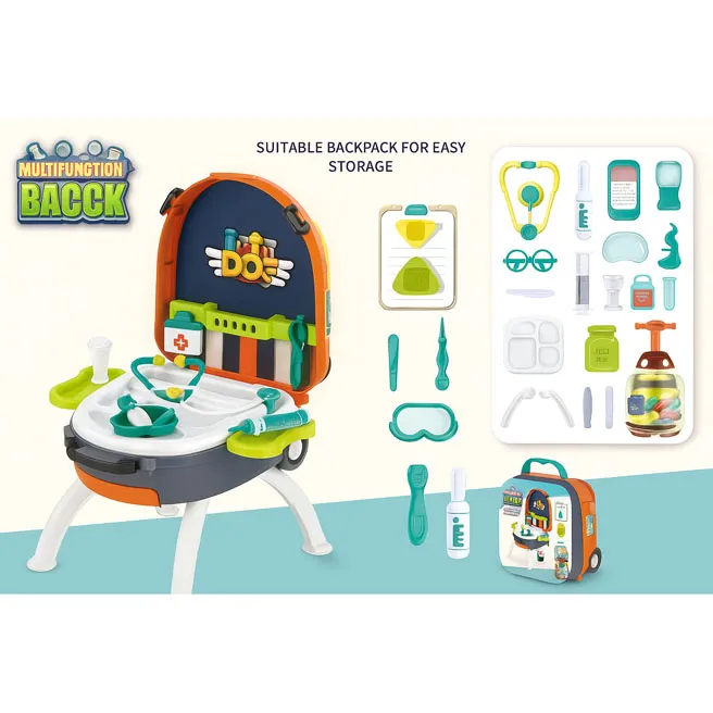 Rucsacul se transformă ușor într-o valiză de joacă comodă, pe care copilul o poate lua cu el oriunde. Jucăria dezvoltă imaginația, atenția și abilitățile de comunicare, precum și ajută copiii să se familiarizeze cu profesia de medic într-o formă ludică.