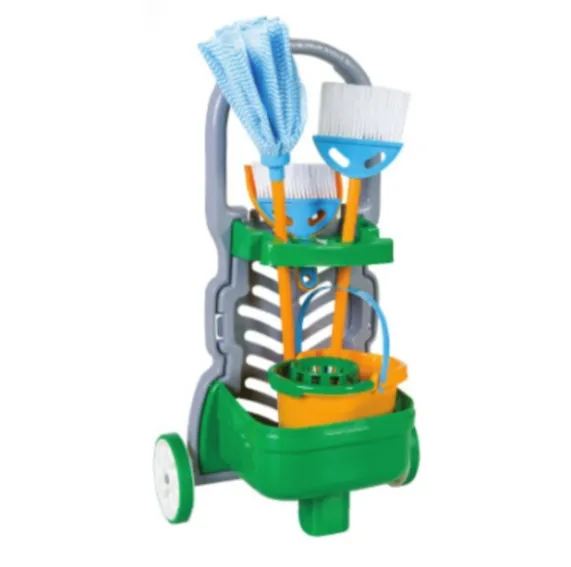 Setul de joacă „Cărucior de curățenie” este o modalitate distractivă prin care copiii pot învăța despre ordinea și curățenia în casă! Setul conține toate accesoriile necesare pentru curățenie: găleată cu sistem de stoarcere, mop, mătură, făraș și perie. Toate piesele pot fi depozitate ușor pe căruciorul cu roți, ușor de manevrat de către copil.